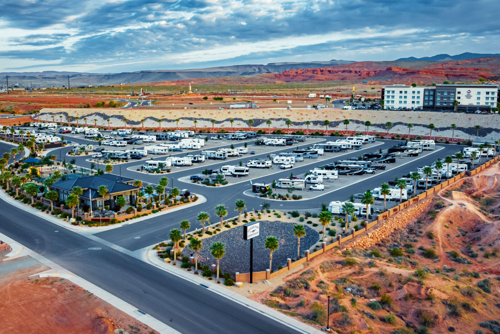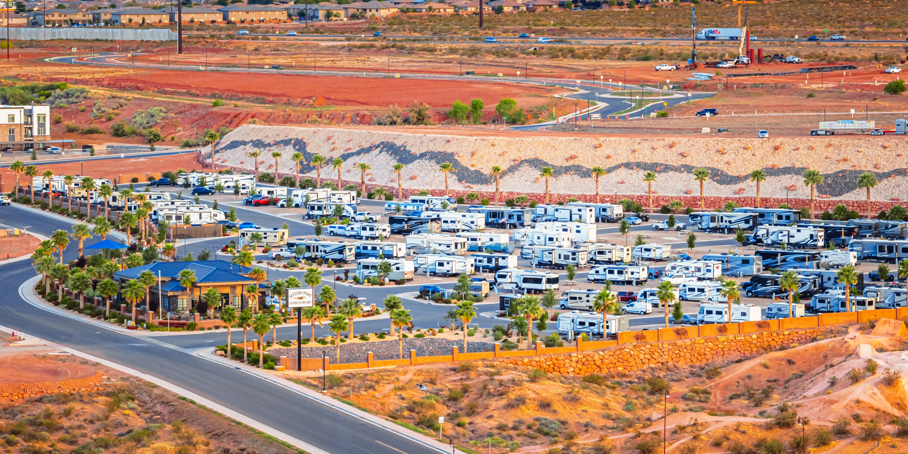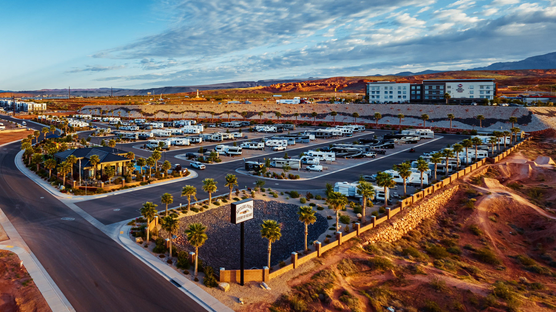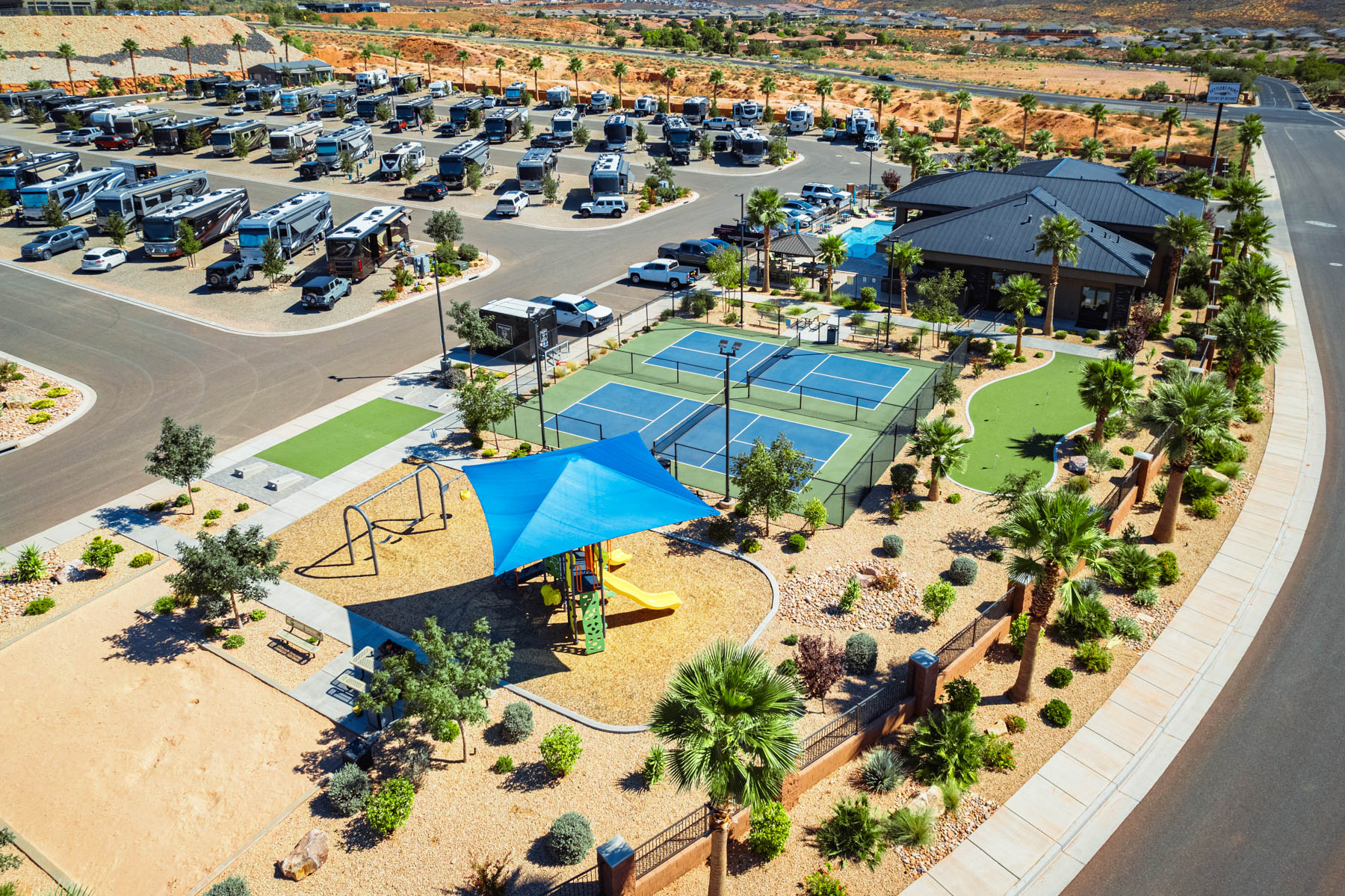 Settlers Point Luxury RV Resort combines full-hookup RV sites with resort-style amenities designed for comfort and convenience. The property sits in Washington, Utah, 20 minutes from Zion National Park and 10 minutes from Sand Hollow State Park. Spacious RV sites, a year-round heated pool and hot tub, lighted pickleball courts, a fenced dog park with agility equipment, and a modern clubhouse give you everything you need for a relaxing stay while exploring Southern Utah.