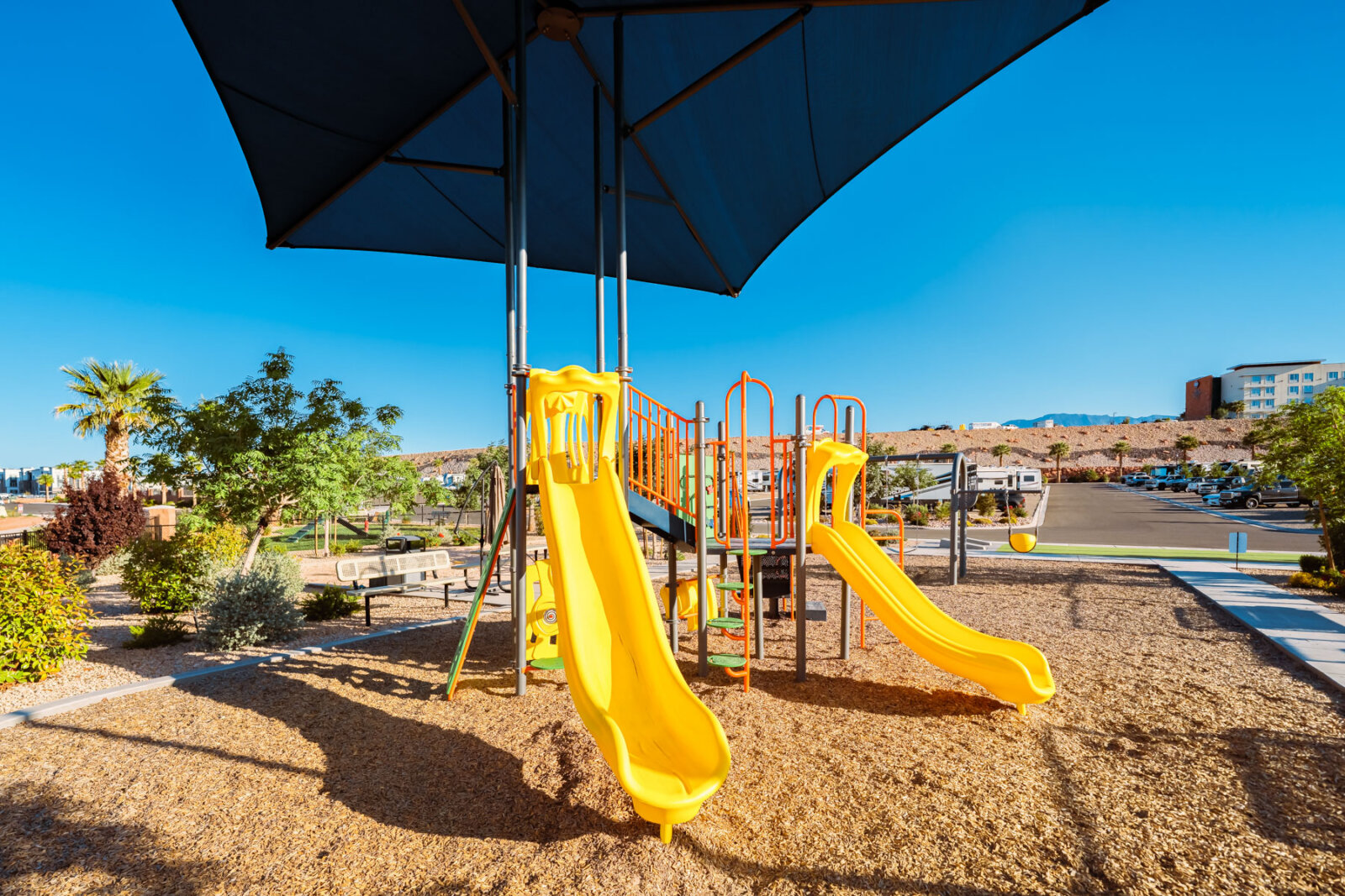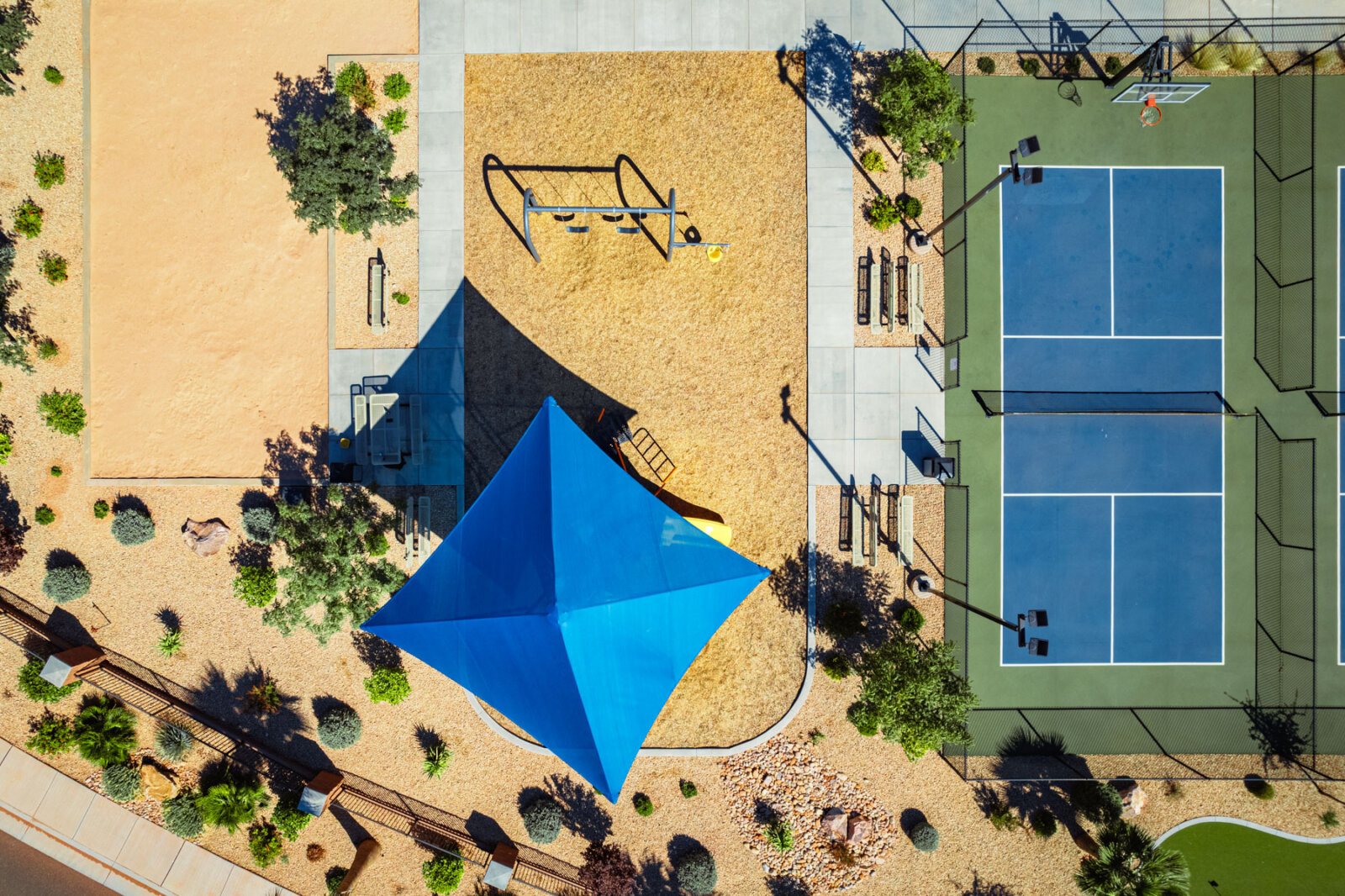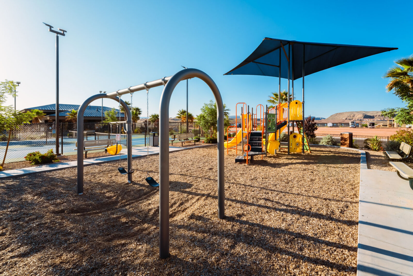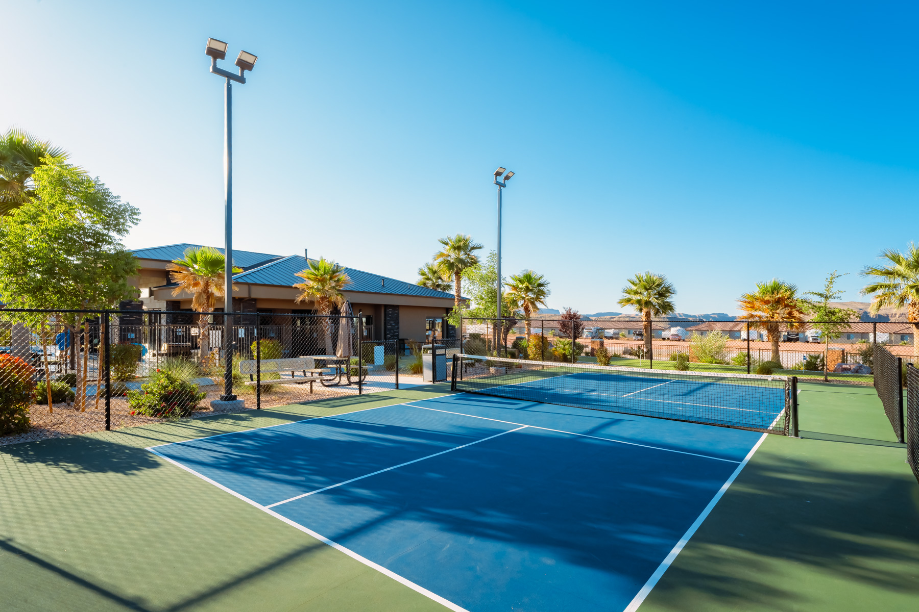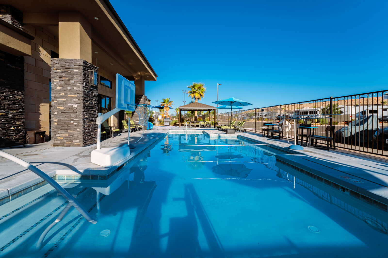 The lighted pickleball courts stay busy with guests of all skill levels throughout the day and into the evening. A half-court basketball area handles pickup games for kids and adults. The covered pavilion provides shaded outdoor space for cookouts, birthday parties, and group gatherings with picnic tables and nearby grill access. The playground features age-appropriate climbing structures, swings, and slides to keep younger guests entertained. Additional lawn games including cornhole and horseshoes are available for families looking for low-key outdoor fun between day trips to Zion and Sand Hollow.