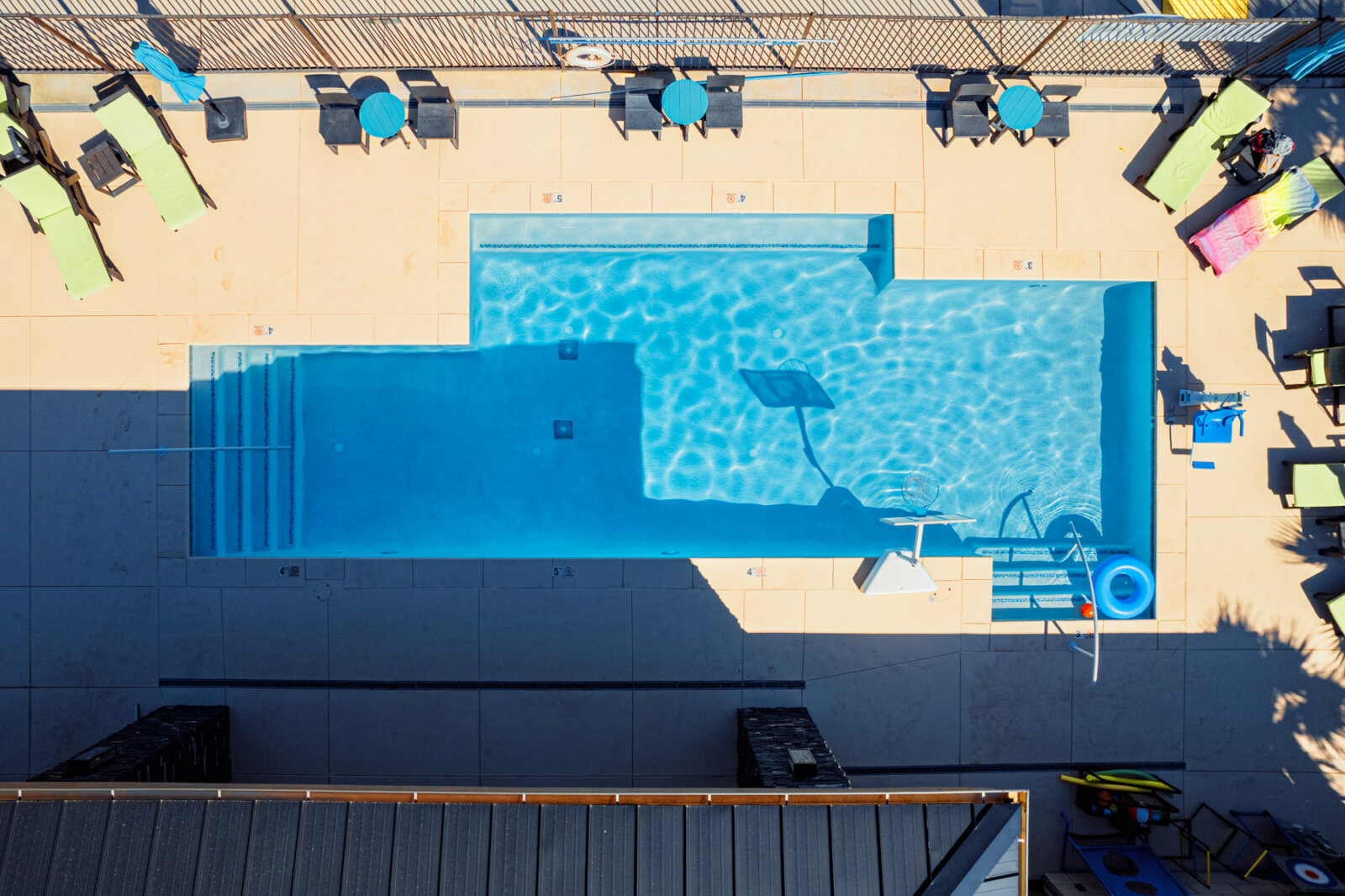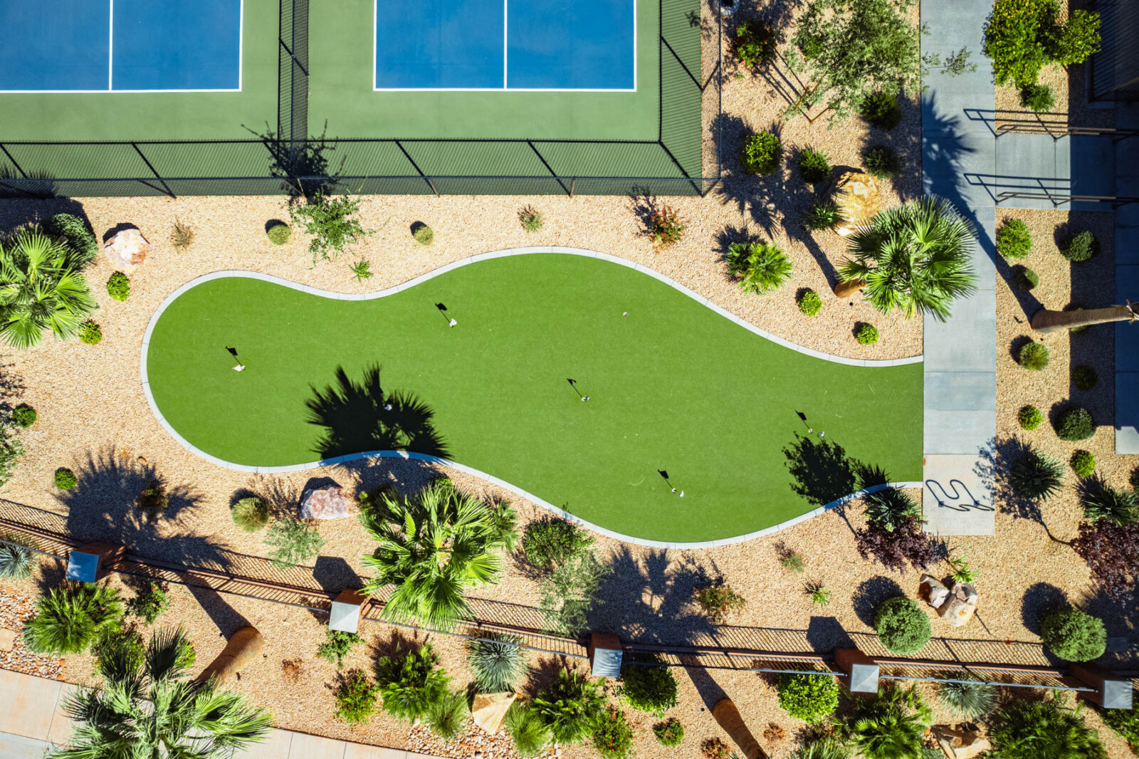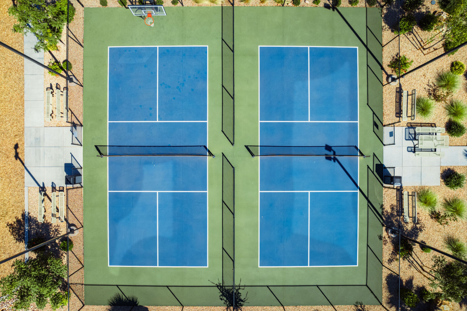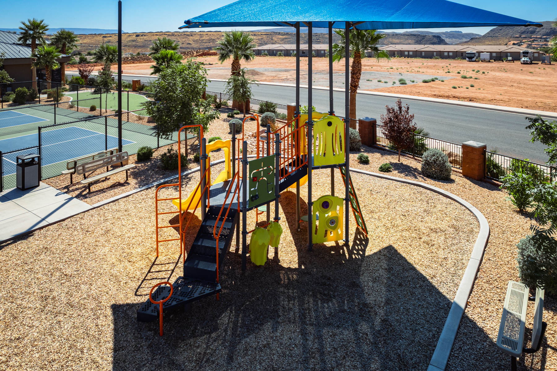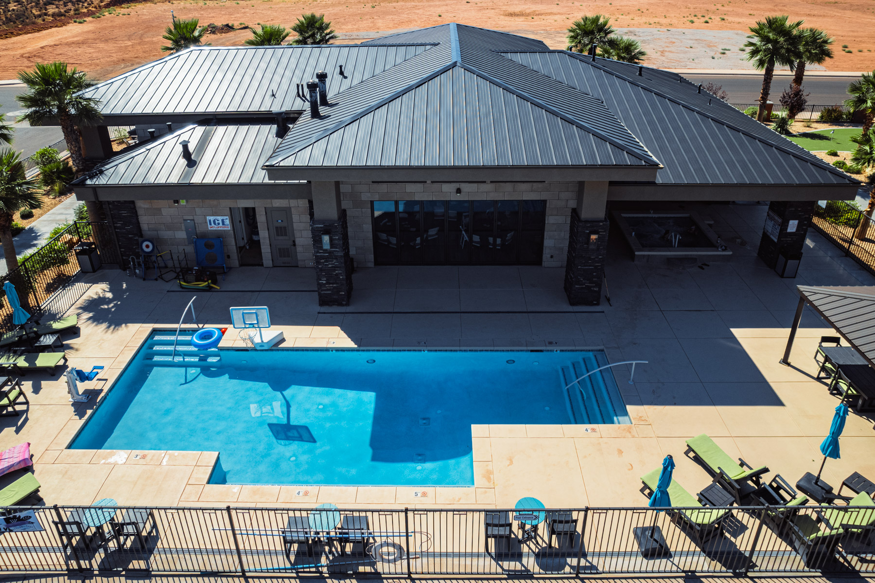 The lighted pickleball courts stay busy with guests of all skill levels throughout the day and into the evening. A half-court basketball area handles pickup games for kids and adults. The covered pavilion provides shaded outdoor space for cookouts, birthday parties, and group gatherings with picnic tables and nearby grill access. The playground features age-appropriate climbing structures, swings, and slides to keep younger guests entertained. Additional lawn games including cornhole and horseshoes are available for families looking for low-key outdoor fun between day trips to Zion and Sand Hollow.