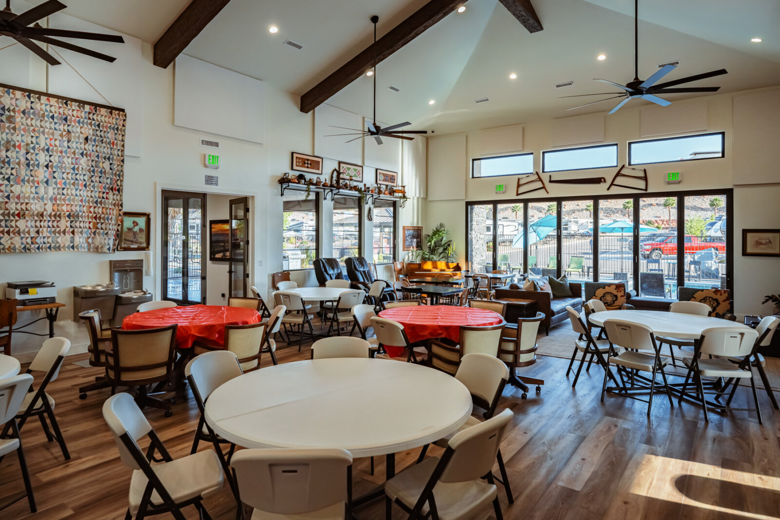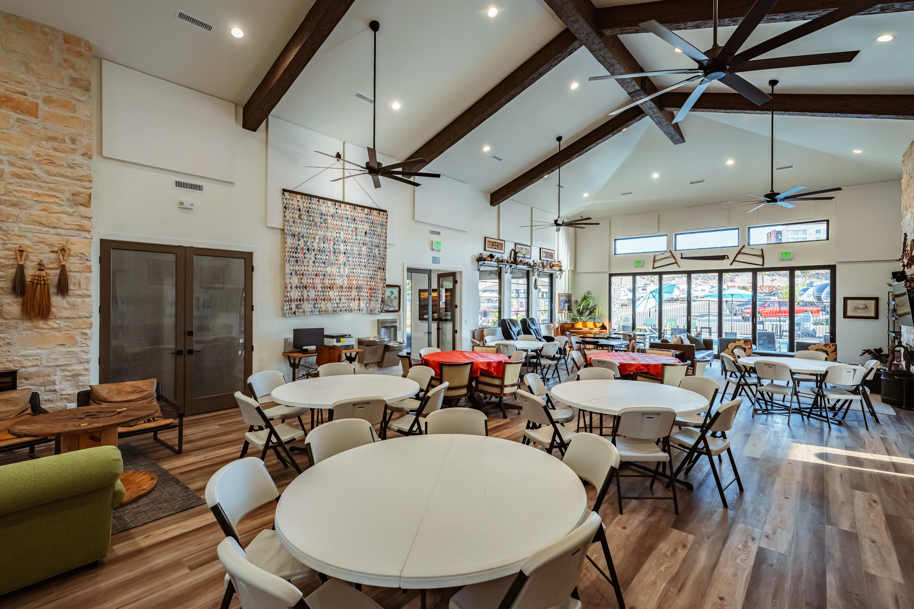 The modern clubhouse provides air-conditioned space for gathering, working, or escaping the midday heat. Inside you will find a full indoor kitchen for meal prep and group cooking, a banquet room available for private events and family gatherings, and a business center with computer access and printer. Complimentary high-speed WiFi covers the entire resort for guests who need to stay connected. A library corner offers books and magazines for quiet reading. Two stone fireplaces, large-screen TVs, and a selection of board games make the clubhouse a comfortable spot for evenings or weather days when you want to stay inside.