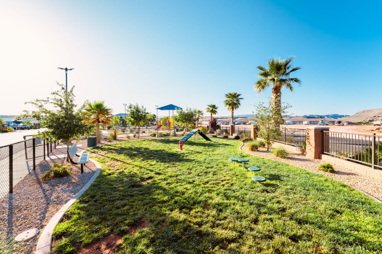The fenced dog park gives your pet room to run with agility ramps, tunnels, water fountains, and shaded seating for owners. A pet wash station near the park makes cleanup easy after dusty trail hikes or sandy lake trips. Settlers Point also offers Pet Concierge services including scheduled walks, daycare, feeding visits, and a Paw Express wagon ride around the resort grounds. You will receive a Pawgress Report with photos and updates, so you can hike the Narrows or explore Snow Canyon without worrying about your dog back at the RV.