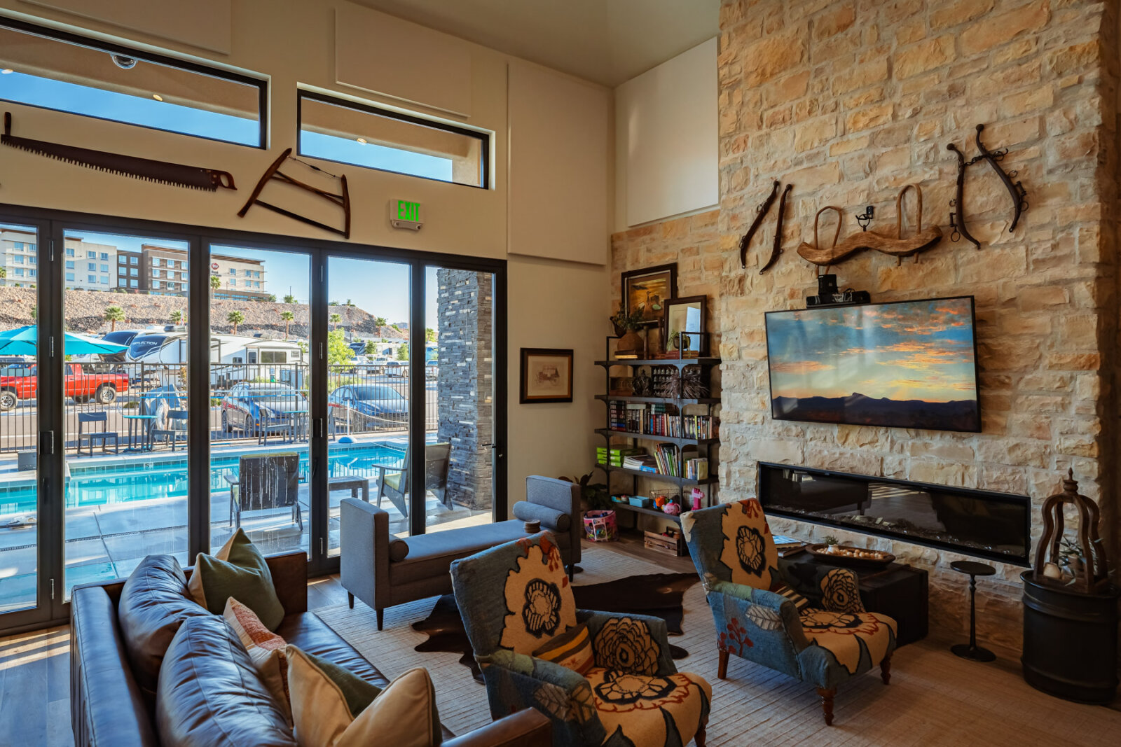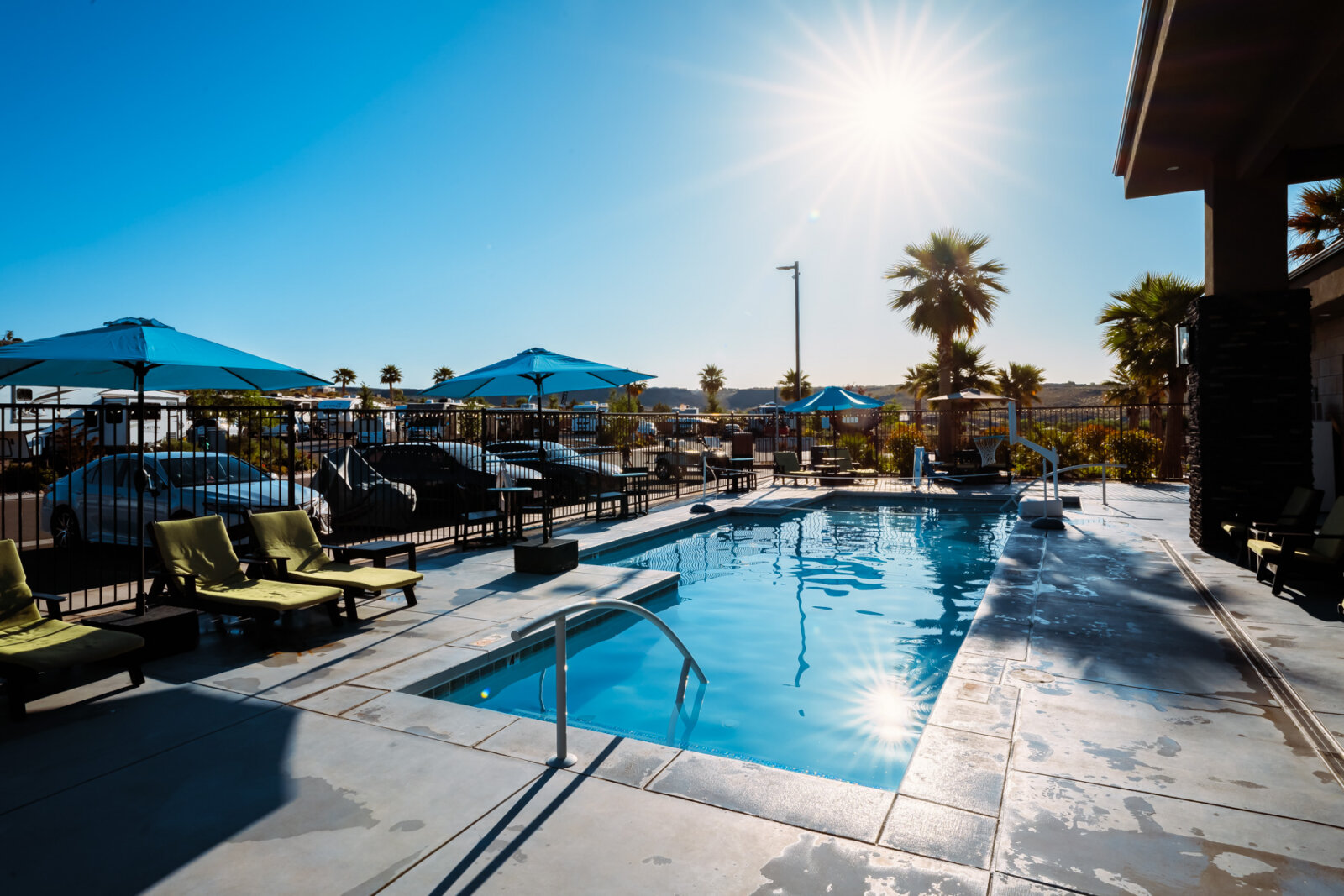 The heated pool and hot tub serve as the social center of the resort. Lounge chairs and shade umbrellas line the pool deck with unobstructed views of the surrounding red rock landscape. The pool stays heated year-round, making it comfortable for swimming even during cooler Southern Utah mornings and evenings. After a day hiking Angels Landing at Zion or kayaking Sand Hollow Reservoir, the hot tub offers the perfect place to relax sore muscles and watch the sunset over the desert.